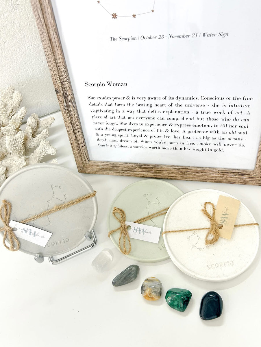 Celebrate the depth and mystery of Scorpio Woman Art Print, Zodiac Coaster, and Scorpio Crystal Tumble Kit. Designed for the soulful Scorpio - powerful, intuitive, and fiercely loyal.