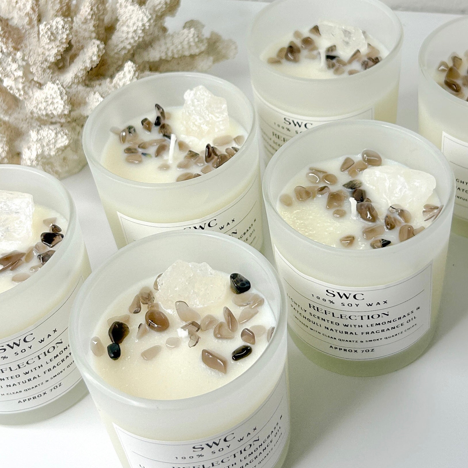 Each candle is topped with clear quartz for amplifying intentions and promoting mental clarity, along with smoky quartz to gently release negativity and create grounding energy.