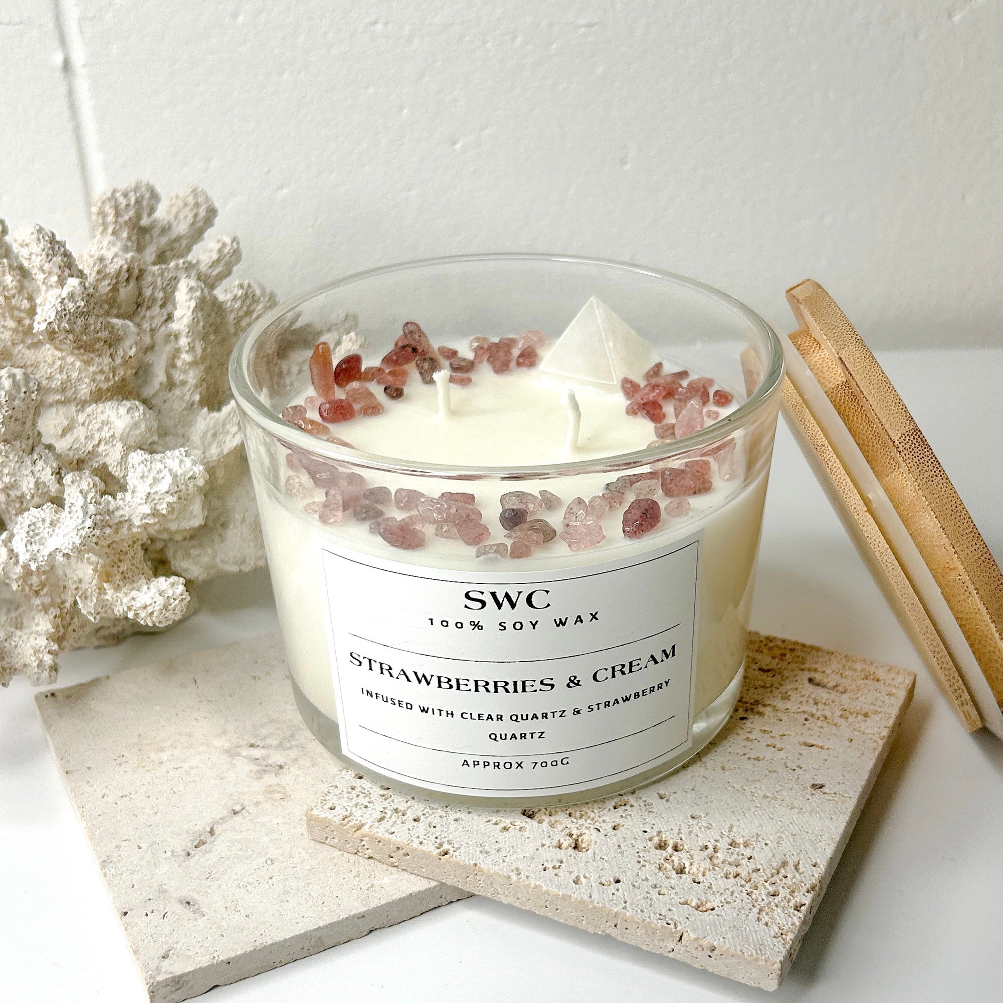 Indulge in the sweet, creamy aroma of our Strawberries & Cream Crystal Candle, a decadent blend designed to uplift your senses and fill your space with loving, joyful energy.