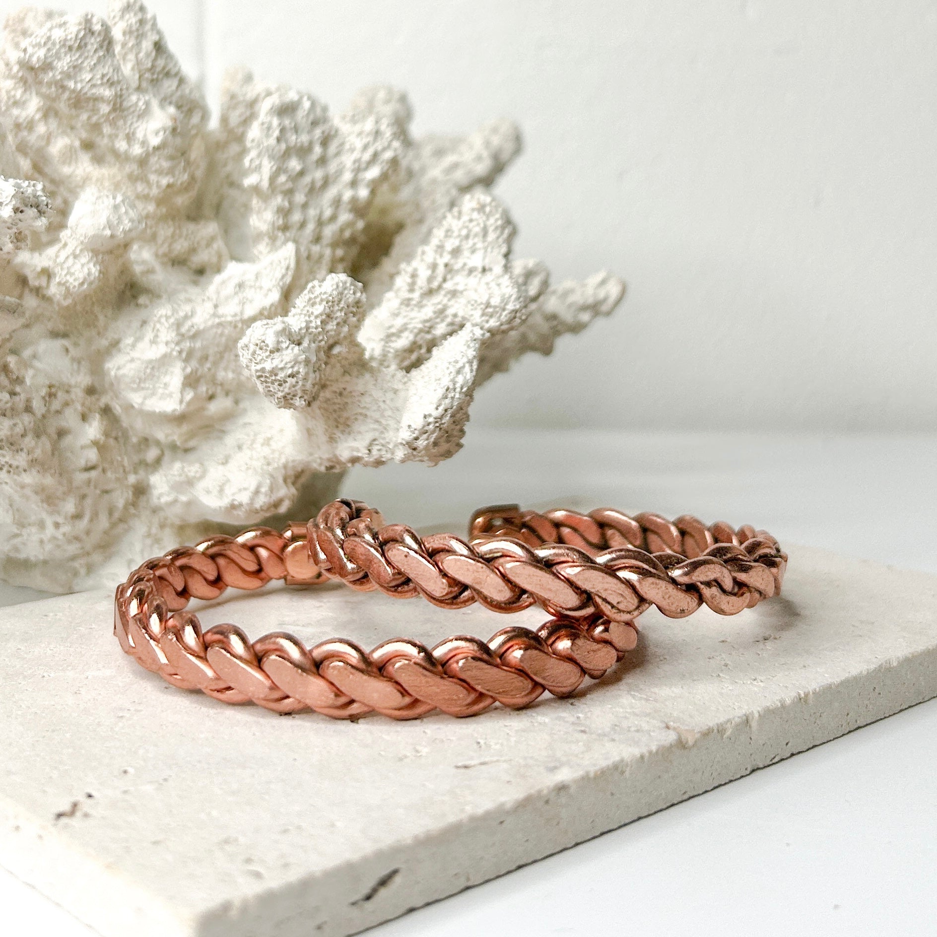 This bracelet consists of copper with small magnets attached at both ends.