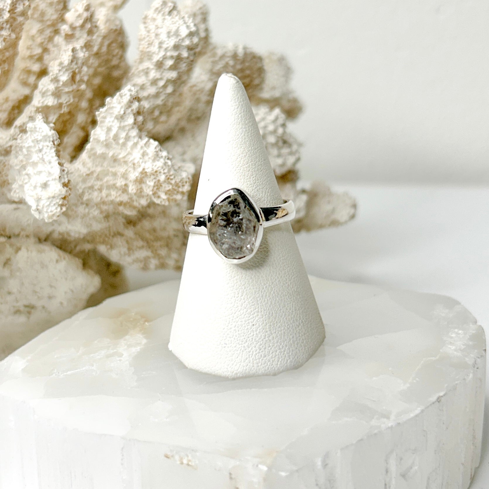 Radiate clarity and light with this elegant sterling silver ring featuring a genuine Herkimer Diamond - a rare, naturally double-terminated quartz crystal found only in Herkimer County, New York. Known as the stone of attunement, Herkimer Diamonds are believed to amplify spiritual energy, enhance intuition, and bring a sense of balance and alignment.