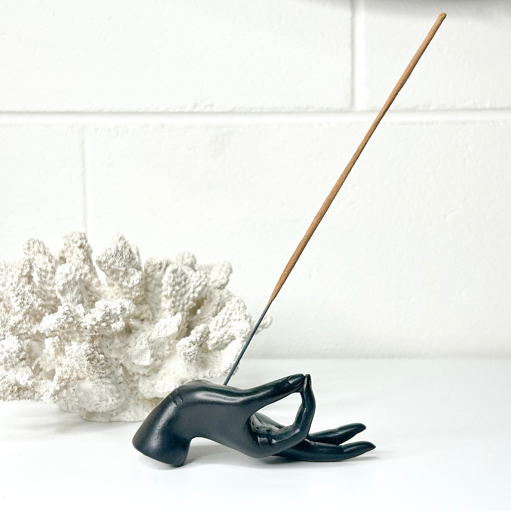 The incense stick rests delicately between the fingers, allowing ash to fall cleanly while creating a beautiful visual of smoke drifting through the air. Its smooth matte-black finish gives it a contemporary, minimalist look that blends effortlessly into any home décor.