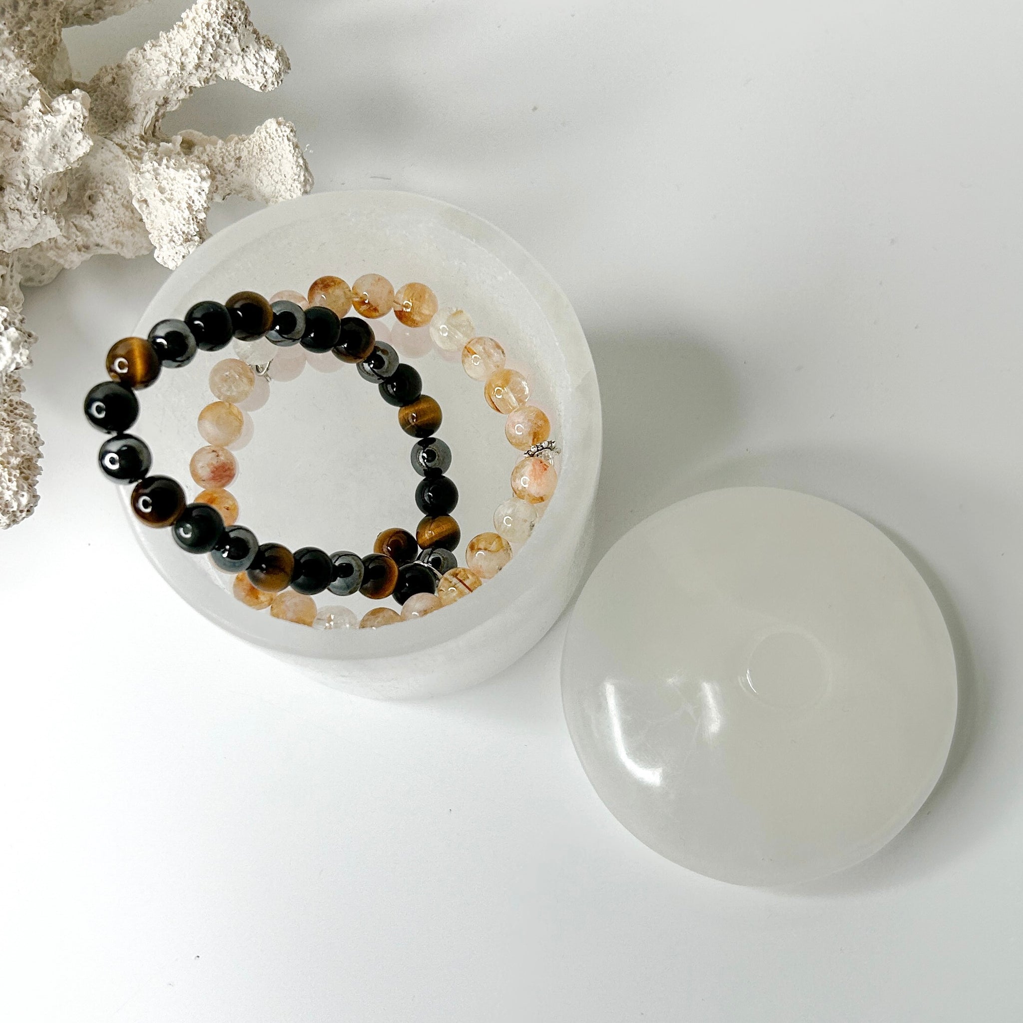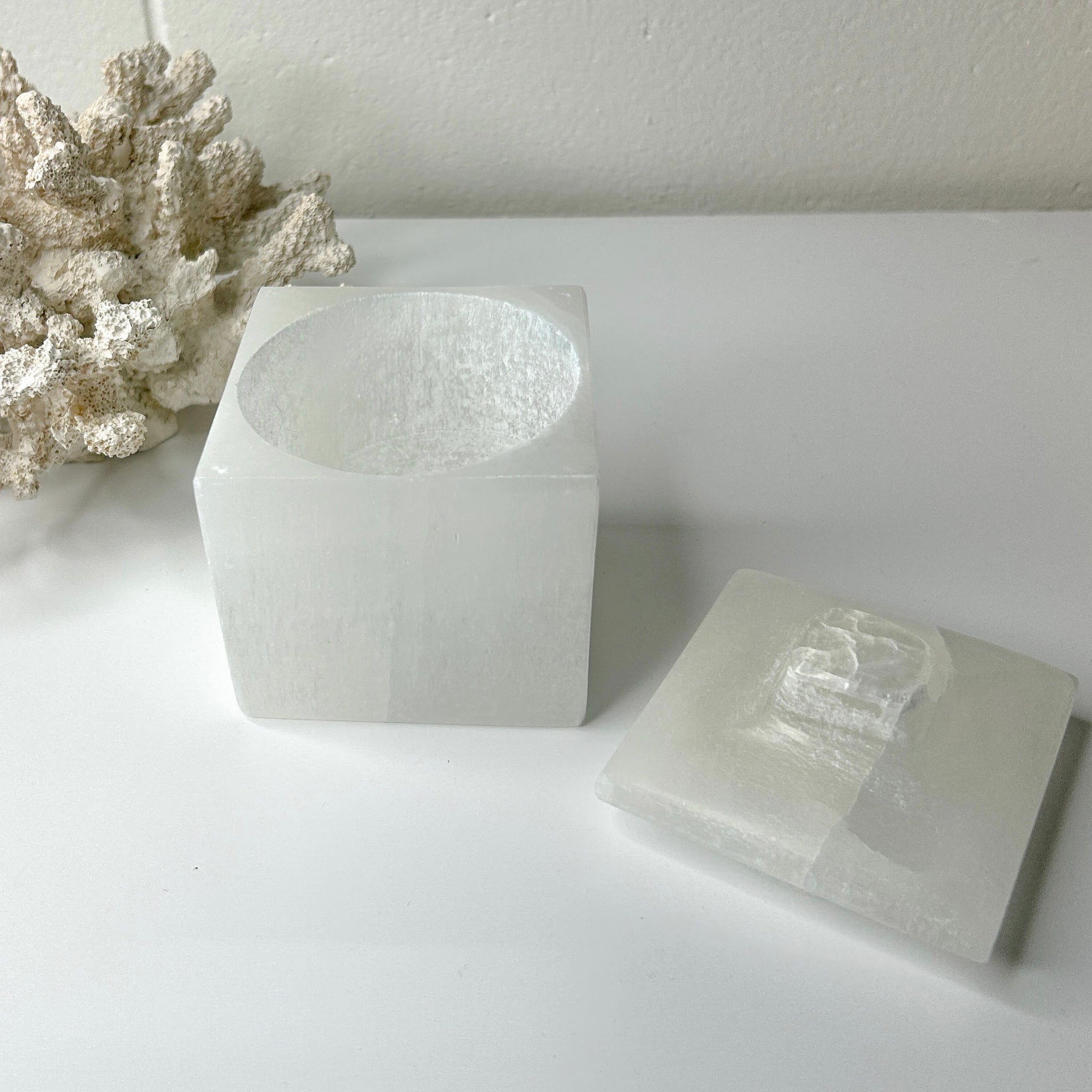 Keep your treasures clear and energetically vibrant with this elegant selenite charging box.